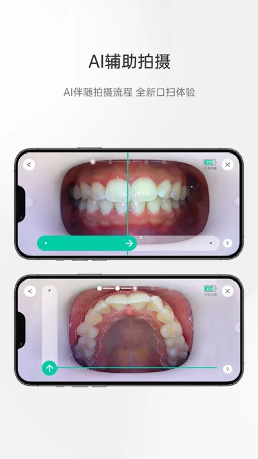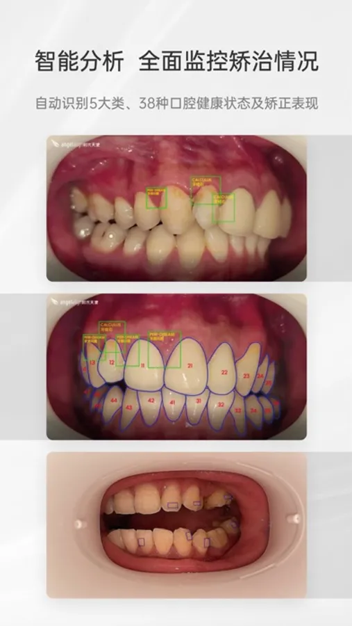 在家拍摄口内照,让医生看到你的每一步变化,AI分析辅助医生随时关注矫正进程及全面的口腔清洁与健康状况,事半功倍更精准。