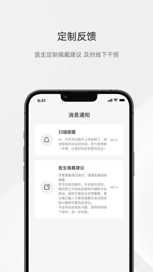 定期线上反馈矫治进程,医生远程把控,如无必要线下操作,在家即可收到医生定制反馈,灵活安排线下复诊。