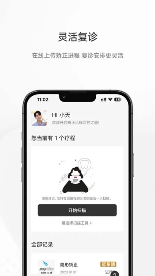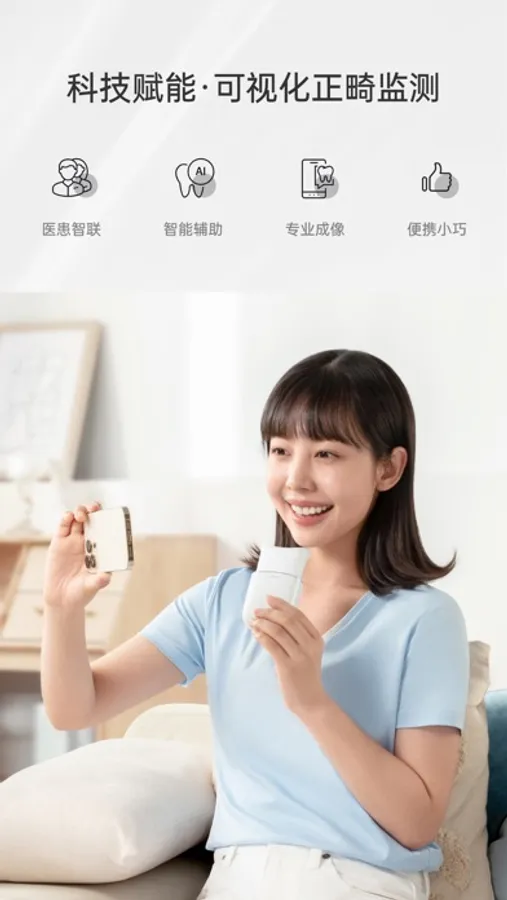 它是一款专属时代天使隐形矫正治疗的矫正伴侣,配合Mooeli家用口扫装置,通过Mooeli手机应用给您的口腔医生传输口内影像资料,最后收到医生的及时反馈,真正实现随时随地连接你和口腔医生。