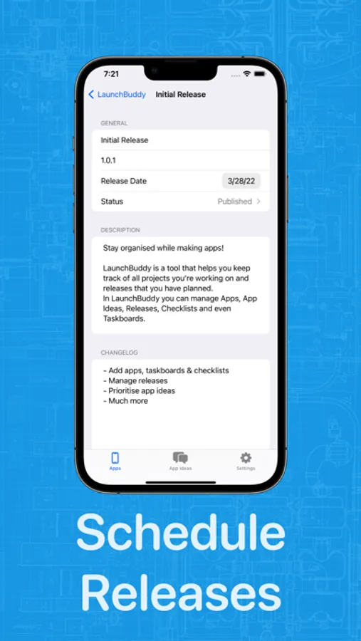 Manage releases & app updates, including release dates, status and changelog. You can add tasks from a checklist to your releases in order to never forget those little details like updating screenshots or writing new marketing copy.