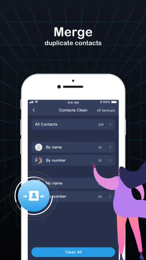 - Merge duplicate contacts by name, number, email