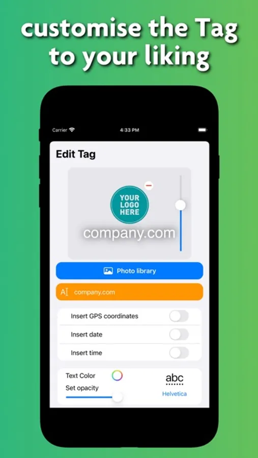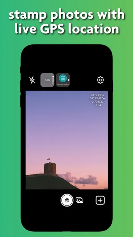 Tag Stampr allows you to take pictures and mark them with custom Text, Logo, Time, Date and even GPS position. You can have as many designs as you want!