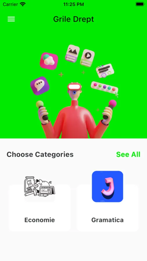 Aplicația conține peste 1000 întrebări pentru fiecare categorie. În viitor dorim sa adăugăm testarea la nivel de capitol.