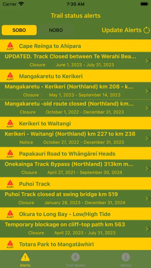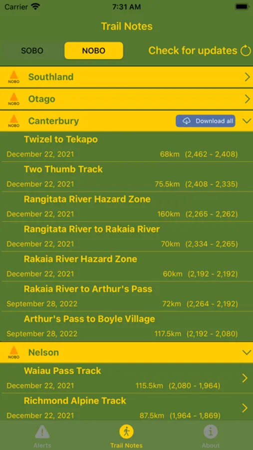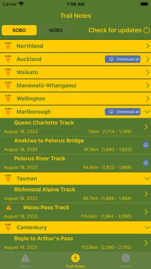 Te Araroa Notes and Maps downloads the official Trail Notes and Maps to your phone so you have access even when out of Internet range. A simple update process keeps you up-to-date with Note changes on the website. Includes full southbound notes, and northbound notes for the South Island. The map display uses gps location to mark your current position on the trail
