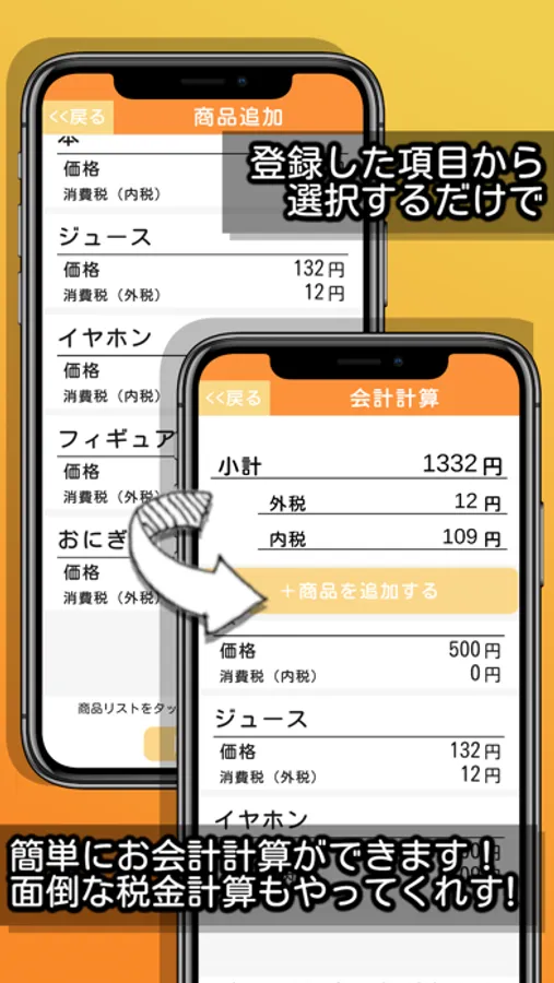 使い方は、先に商品を登録してお会計画面で登録した商品を選択するだけ!