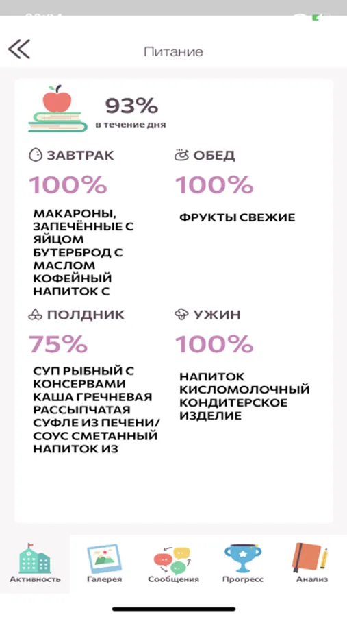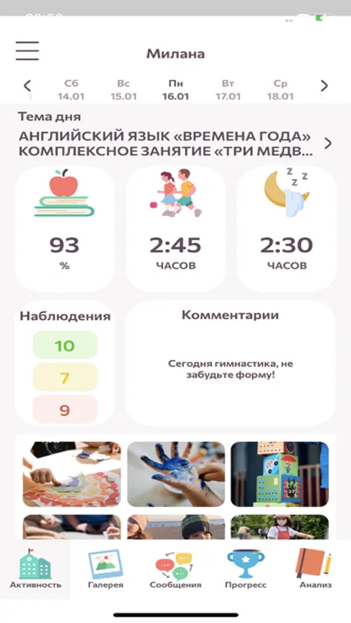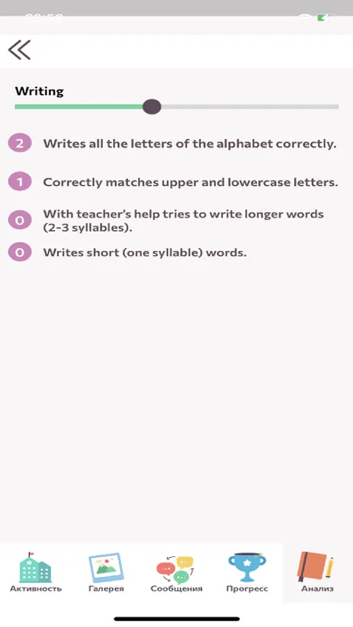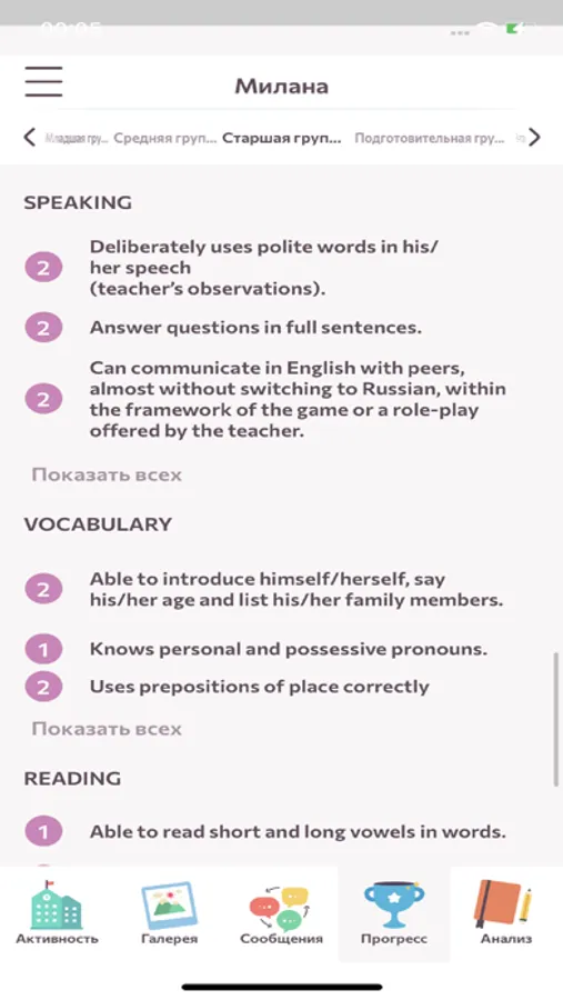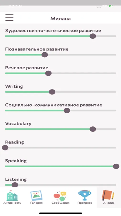 • Прогресс развития ребенка по программе Sunschool