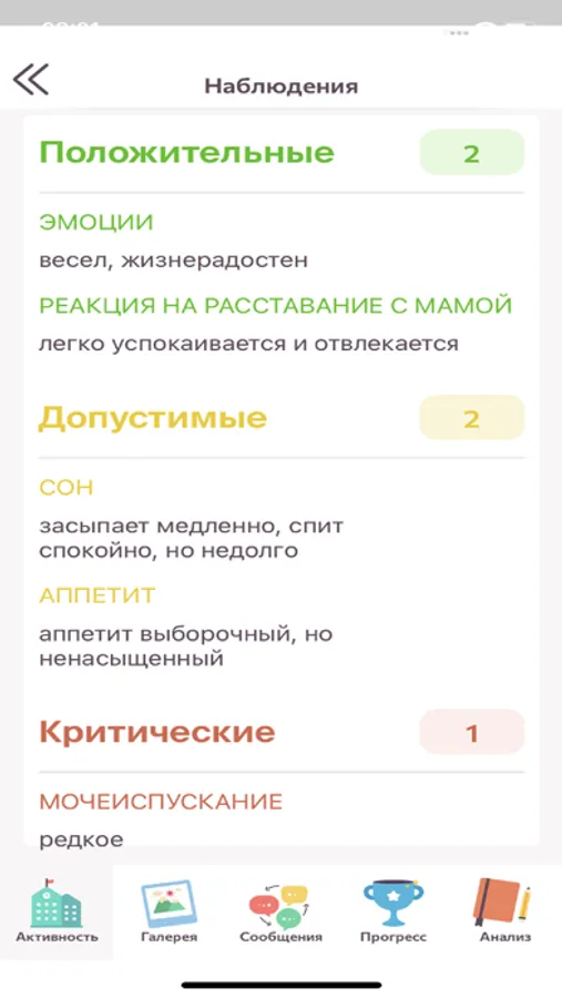 • Режимные журналы (Питание, Сон, Прогулка)