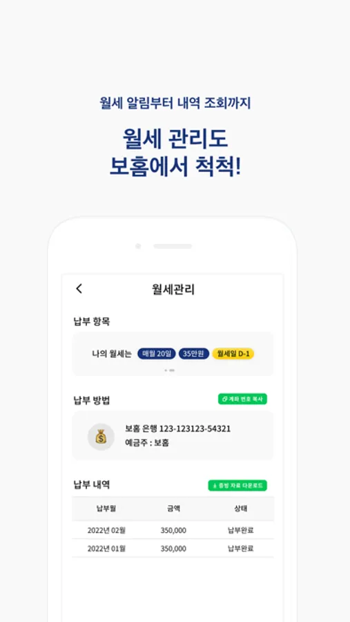 입주 후에는 우리집 계약 정보를 쉽게 확인하실 수 있고 또한, 나의 월세 납부일자와 계좌 정보, 납부 내역을 확인할 수 있고 추후 증빙자료로도 사용가능합니다.
