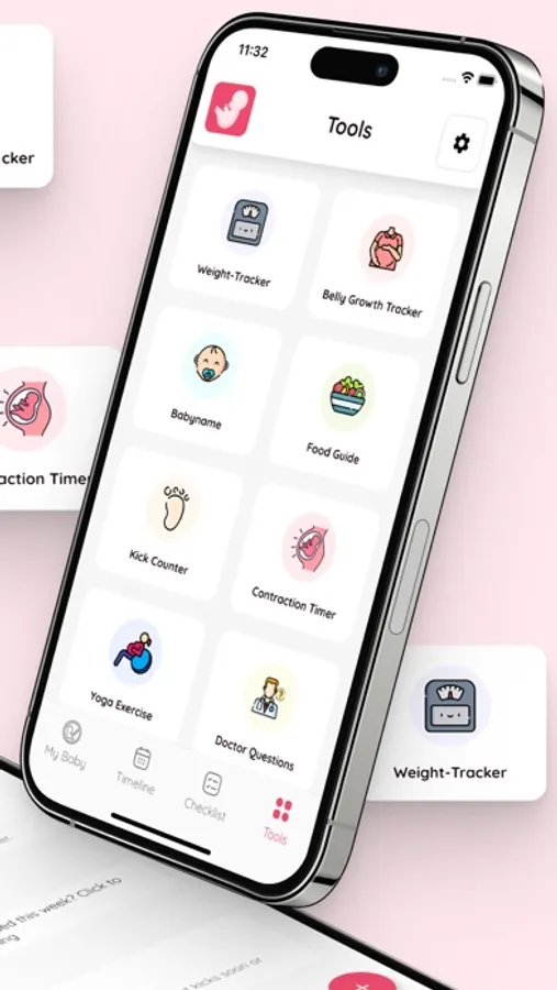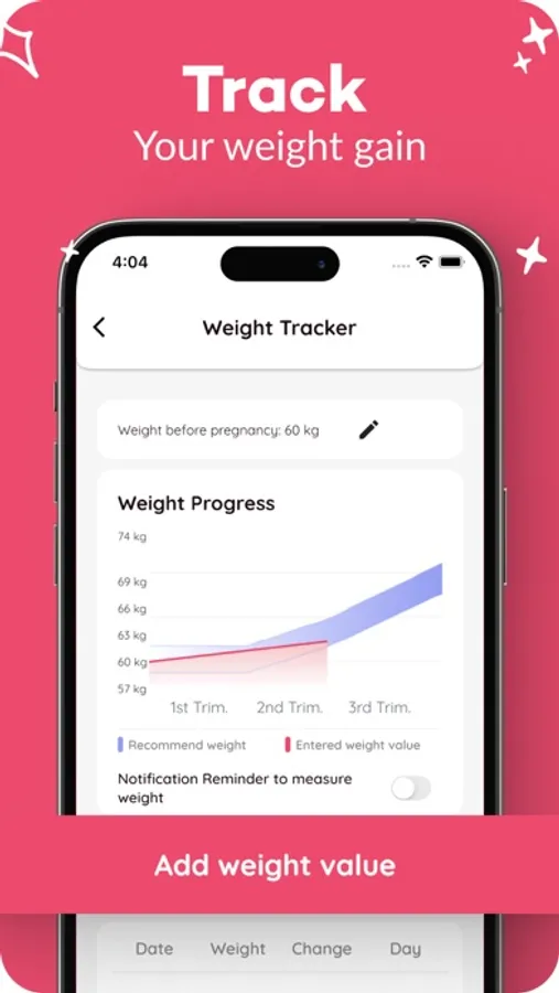 You can keep track of your weight & tummy growth, the baby's first movements and contractions. Journal your pregnancy in our Timeline and export it to keep a memory of your journey.