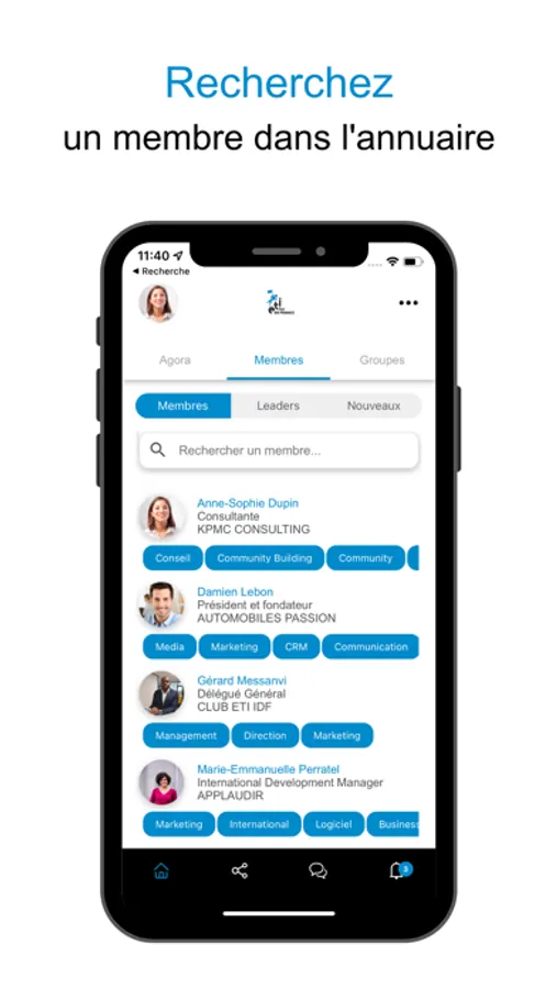 Recherchez facilement un membre de la communauté par nom, prénom, entreprise, compétence... L'essentiel pour faciliter votre networking entre dirigeants !