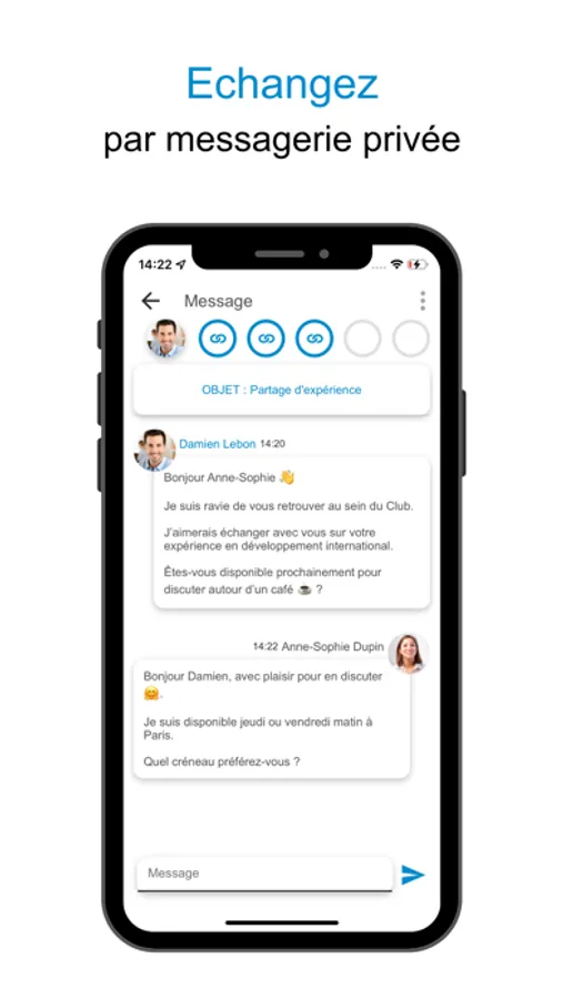 Échangez facilement avec les membres de la communauté via une messagerie privée non invasive (coordonnées non visibles par les autres membres, sélection des contacts avec lesquels vous souhaitez échanger)