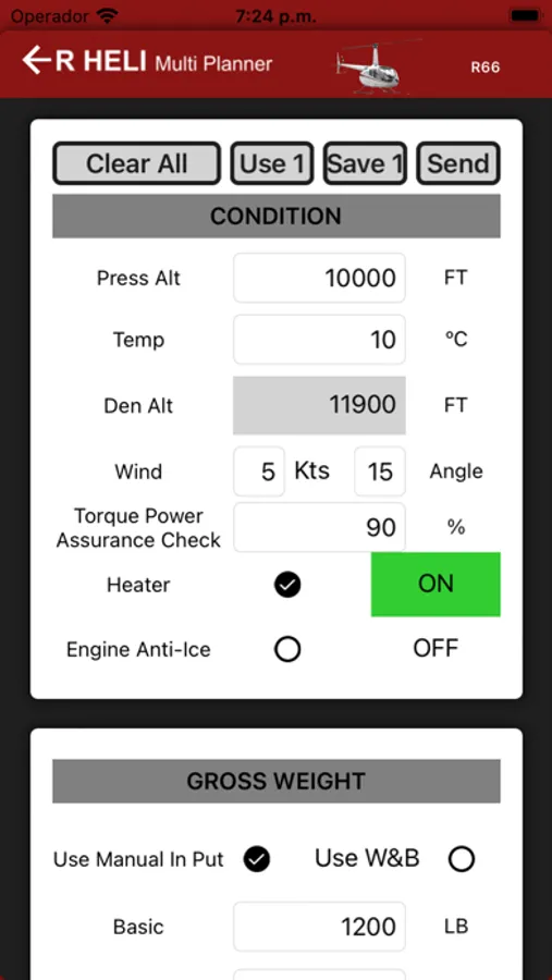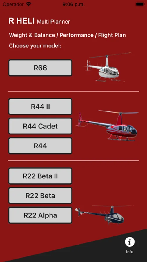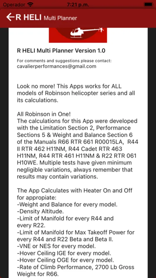 The calculations for this App were developed with the Limitation Section 2, Performance Sections 5 & Wight and Balance Section 6 of the Manuals R66 RTR 661 R00015LA, R44 II RTR 462 H11NM, R44 Cadet RTR 463 H11NM, R44 RTR 461 H11NM & R22 RTR 061 H10WE. Multiple tests have given minimum negligible variations, always remember that results may contain variations.
