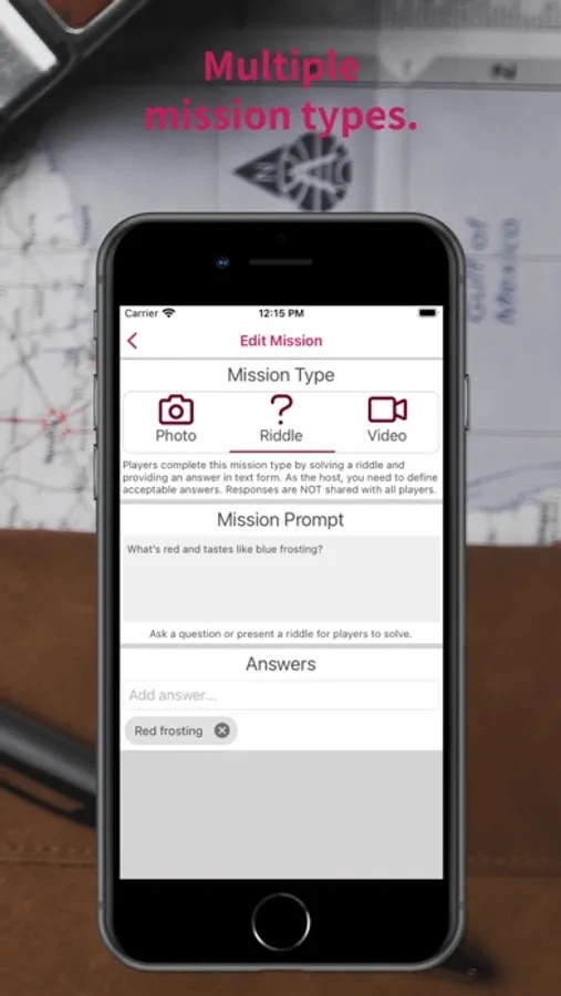 Riddle: Players complete this mission type by answering a question or riddle by trying to guess a secret word, phrase, or number set by the game host.