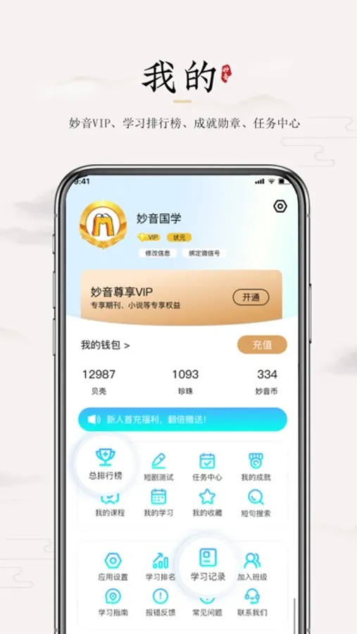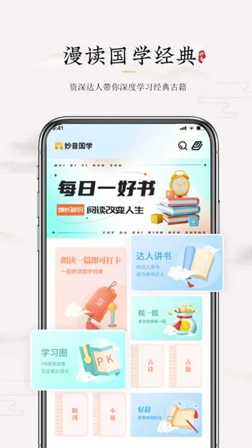 妙音国学课程学习内容,为各年龄阶段国学爱好者提供有深度、有温度的通识知识课堂文化社交学习平台,用心制作精品国学课程,国学经典、古诗词、文言文、国画、书法、围棋、唐诗宋词三百首、历史文化、成语故事、世说新语、古文观止,借助互联网高新技术,结合动漫、视频音频、直播、数字人AI软件、训练营等大众喜闻乐见的形式,方便您通勤路上,睡前,晨起跑步,家务陪伴的闲暇碎片时间打开妙音国学APP,在生活中感受国学经典。妙音国学宗旨是:引领国学新时尚,让国学流行起来。