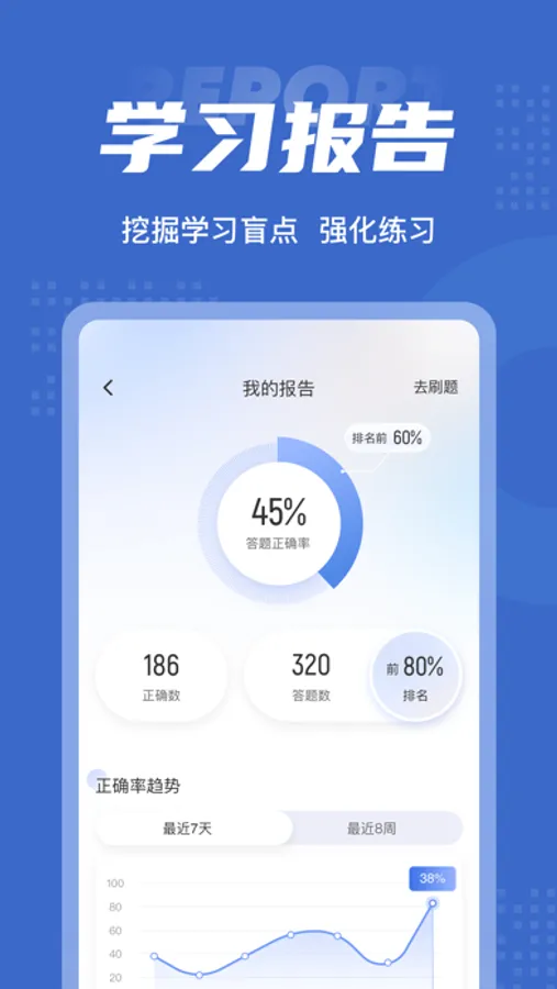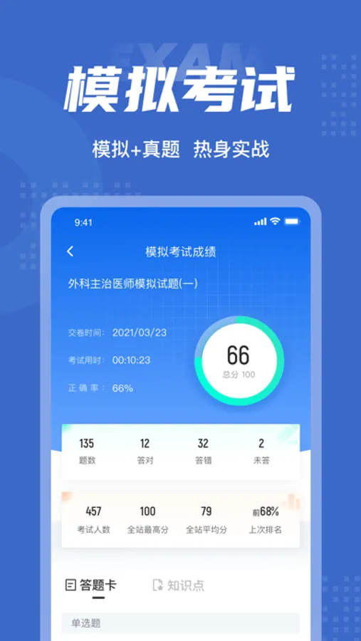 外科主治医师题库内含考点练习,全国通用卷以及地区卷模拟练习,以及按照固定考试比重的随机式的抽题的真题考场,成绩单实时记录考试数据,一点一滴的反馈考生近期学习状态以及自我正确率的提升,大大的给予考生通过考试的信心。