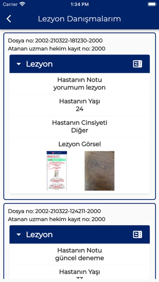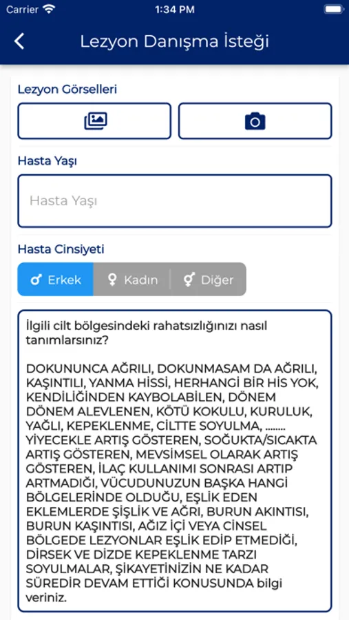 “Lezyon Danışma İsteği Gönder” tuşuna bastığınızda, sistemimizde aktif olarak cevap vermek için hazır bulunan dermatoloji uzmanlarımıza yaşadığınız cilt sorunu ile ilgili iyi kalitede çekilmiş 3 adet fotoğrafı gönderebileceksiniz. Dilerseniz lezyona ait görseli o esnada telefonunuzun kamerasını kullanarak da yükleyebilirsiniz. Danıştığınız bu lezyon kime ait ise o kişinin yaşını ve cinsiyetini ilgili kısma girmeniz gerekmektedir. Size referans olması amacıyla hazırlanan “İlgili cilt bölgesindeki rahatsızlığınızı nasıl tanımlarsınız?” kutucuğunda örnek olarak yazılı ifadeler ile veya sizin kendi ifadeleriniz ile “Yorumunuz” kutucuğuna görüşlerinizi belirtmeniz gereklidir. Güzel ve detaylı bir yorum hastalığınızın olası tanısını, yapılması gerekenleri ve mümkünse tedavisini öğrenebilme konusunda en önemli aşamadır.