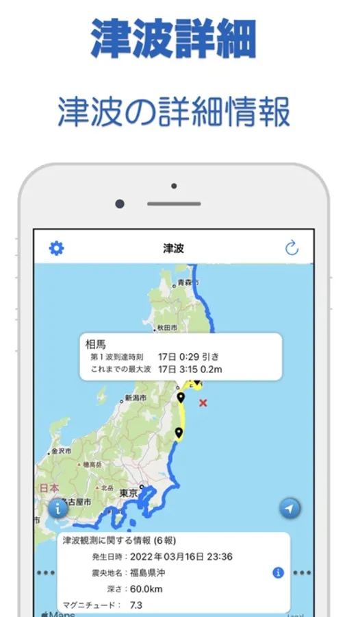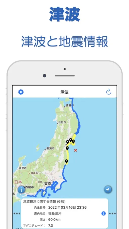 地震発生時など、地震情報(「発生時刻」「震源地」「震度」「マグニチュード」)がアプリ上で確認することが出来ます。