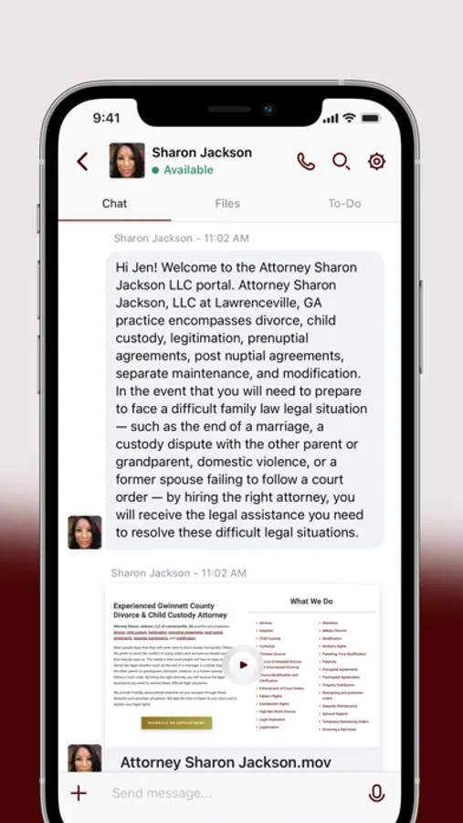 At Attorney Sharon Jackson, LLC, we take the time to listen to your story and to explain your legal rights. We provide friendly, personalized attention as you navigate through these stressful and uncertain situations. Use our app to interact with our team via secure text, audio, and video messaging, schedule virtual meetings, share documents, e-sign files, stay updated on your case, and more.