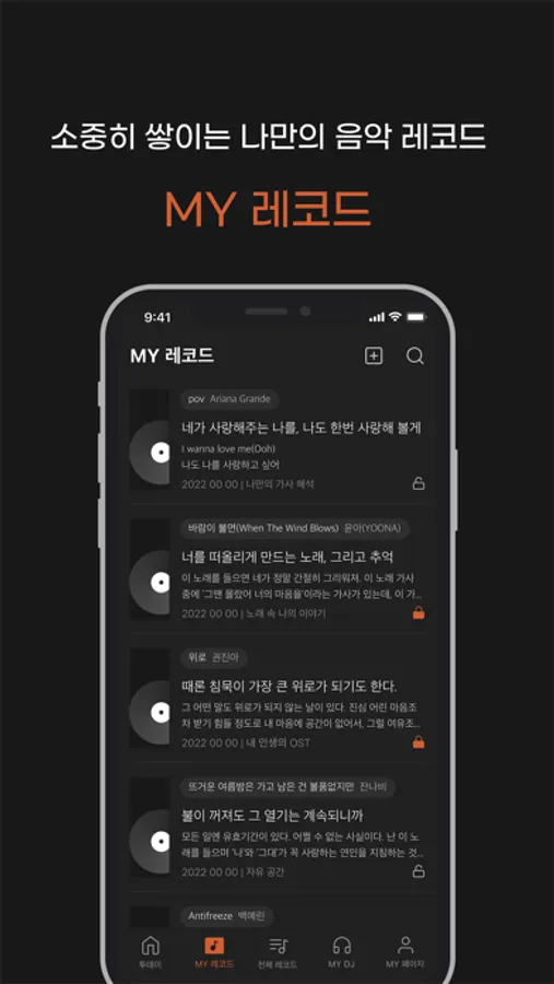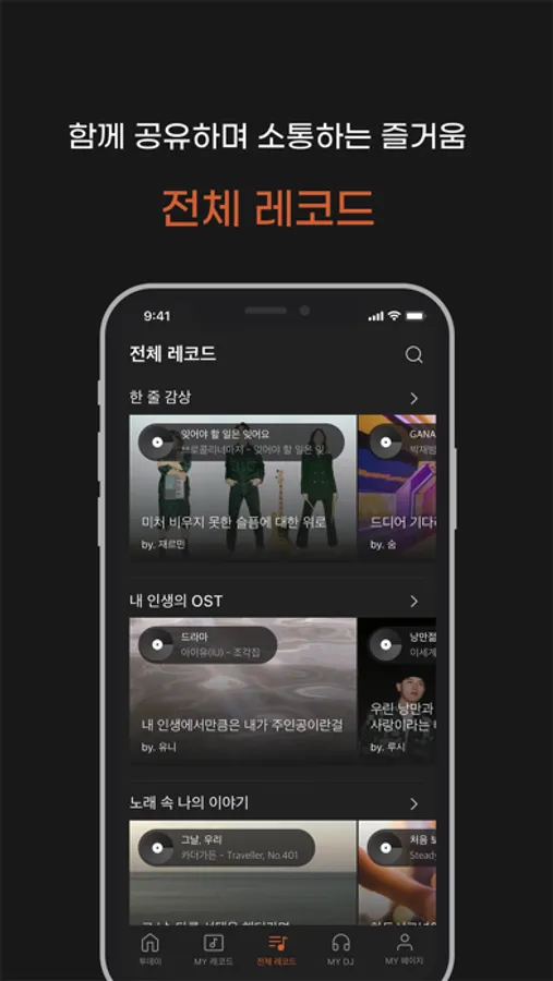 나와 취향이 맞는 DJ를 팔로우하여 최신 기록을 모아보세요. 노래로 함께 공감하고 소통하며 감정을 교류해 볼 수 있을거에요.
