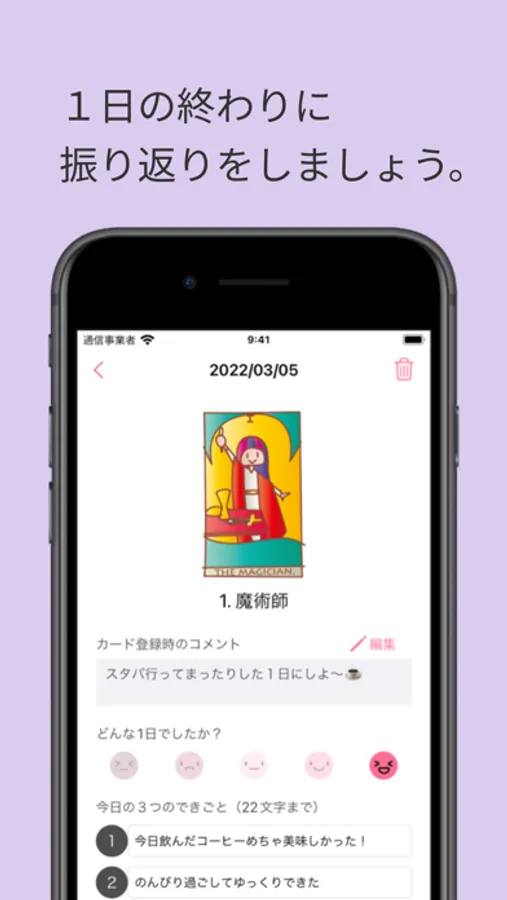 あなたが引いたタロットカードと一緒に、今日がどんな1日だったかを記録することができます。