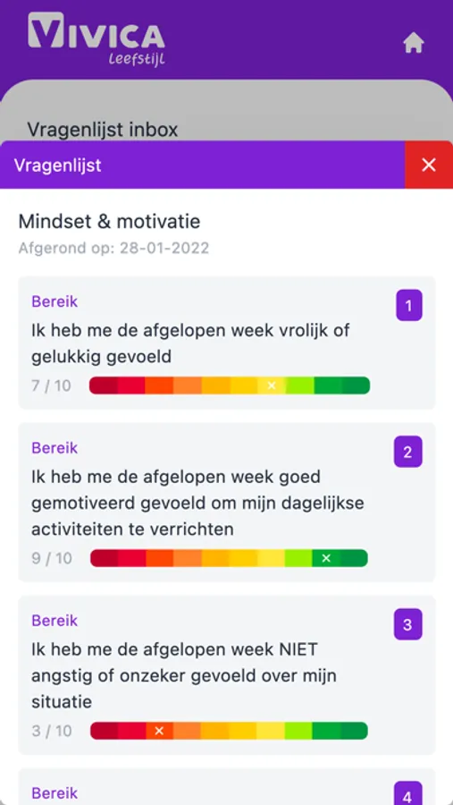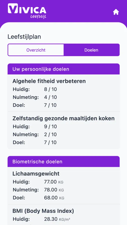 De Vivica Leefstijl app maakt onderdeel uit van het Vivica Leefstijl platform. De app staat in direct contact met het dashboard van uw zrgverlener of coach. Via de app wordt u geheel, of ondersteunend aan bijeenkomsten of behandeling, begeleid op het vlak van beweging, voeding, motivatie, roken, alcohol, slaap en/of ontspanning. Via de app heeft u inzicht in de progressie op doelen, kunt u thuismetingen registreren en wordt u via video’s of artikelen geïnformeerd over leefstijl of uw behandeling in het ziekenhuis.