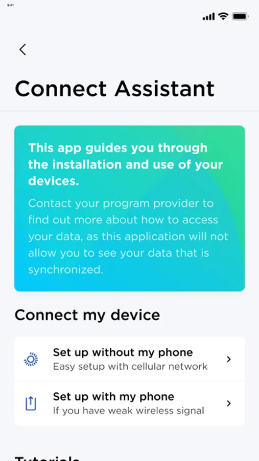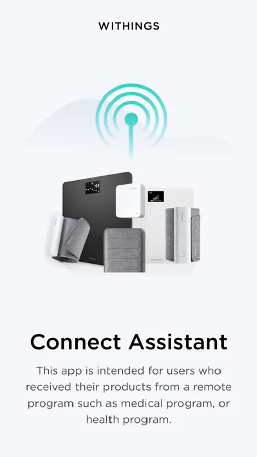 The Connect Assistant app equips patients and health programs’ participants with a convenient solution that turns any Withings cellular device into a Wi-Fi or Bluetooth device when your cellular connection is not available. Use the Connect Assistant app to be guided through the steps to easily activate an alternative connection on your Withings cellular devices ensuring your data measurements are captured. No technical set up required!