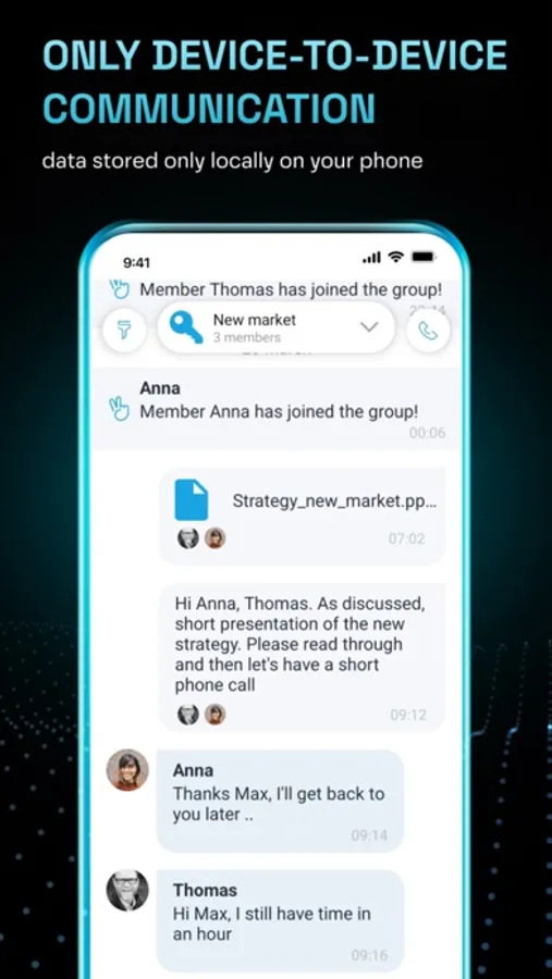 Communications and data exchange take place in closed groups available by an invitation only. The invitation code is valid only once and for one hour.