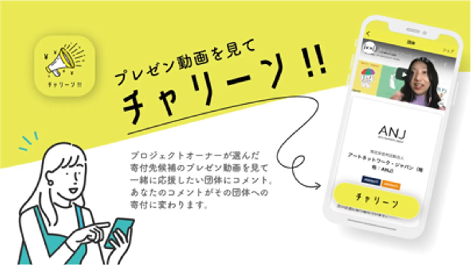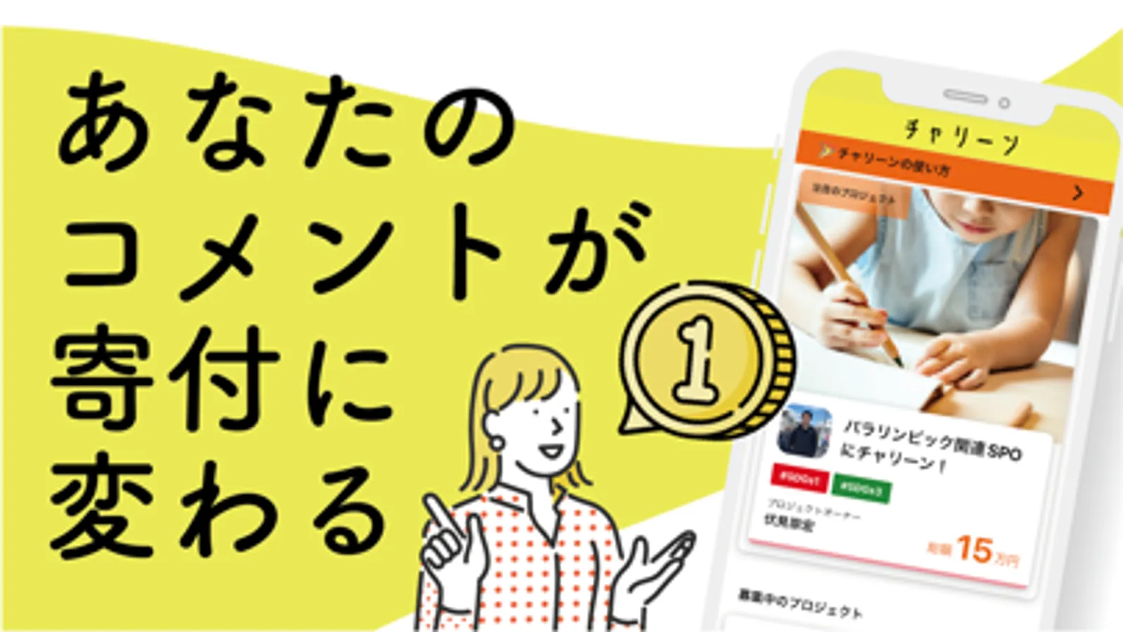 チャリーンはコメントが寄付に変わるアプリです。寄付先候補のプレゼン動画を見て、応援したい団体にコメント、