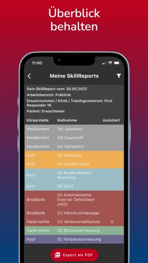 SkillReport ermöglicht dir das Sammeln, Speichern und Versenden deiner notfallmedizinischen Massnahmen. Mittels weniger Klicks erstellst du dank der intuitiven Benutzeroberfläche deinen SkillReport. Eingabe, Bearbeitung und Speicherung sind ohne bestehende Internetverbindung möglich. Durchsuche deine Datenbank mittels Filterfunktion und exportiere deine SkillReports als PDF an alle dir wichtigen Institutionen. Aktuell ermöglicht SkillReport einen interprofessionellen Zugang für die Länder Deutschland, Österreich, Schweiz, Südtirol und Liechtenstein.