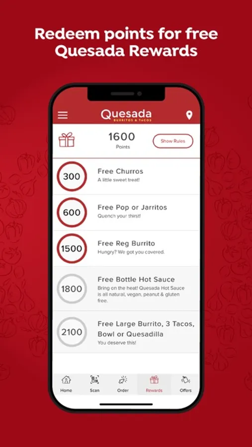 Order for Pick Up or Delivery, earn points, get rewarded! Earn 10 points for every dollar spent before tax and redeem for free food or drinks. Enjoy rewards like delicious churros, Burritos, Quesadillas or Tacos!! The more you order, the more points you get.