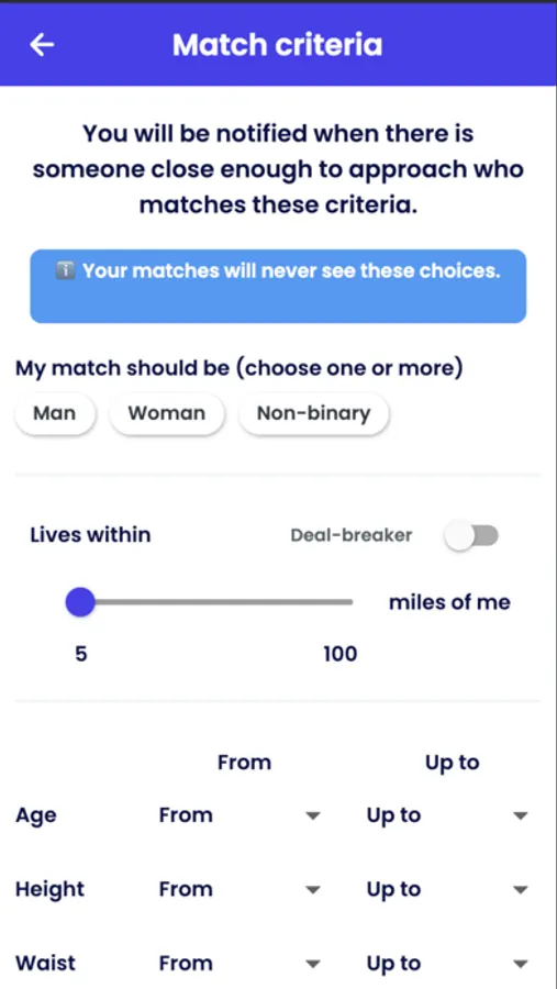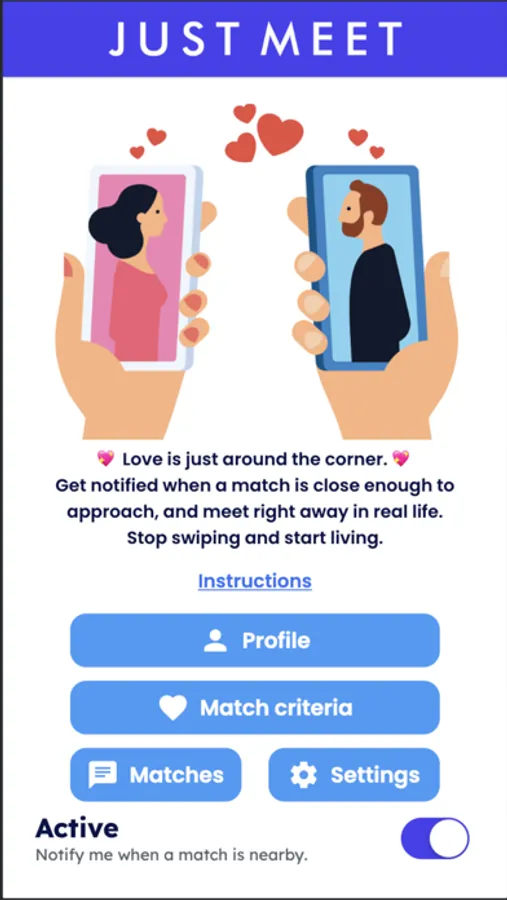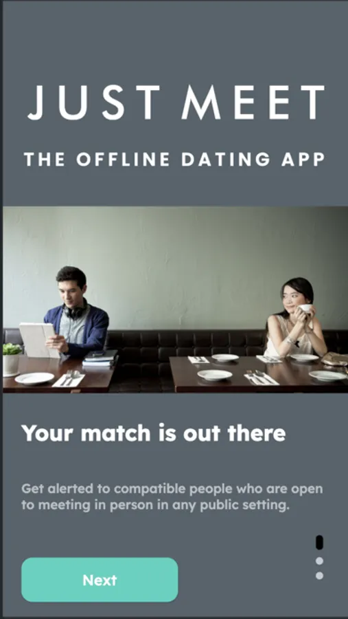 Find people who are compatible and open to meeting you in person in any public setting. No swiping, no texting, no phone/video calls. Set up your profile and match criteria once, then put your phone away and go live your life. You'll be notified whenever a compatible match is nearby, and you'll get to exchange photos and interests before revealing your precise location. Once you do, you'll get to meet your match instantly, for as short or long as you both want.