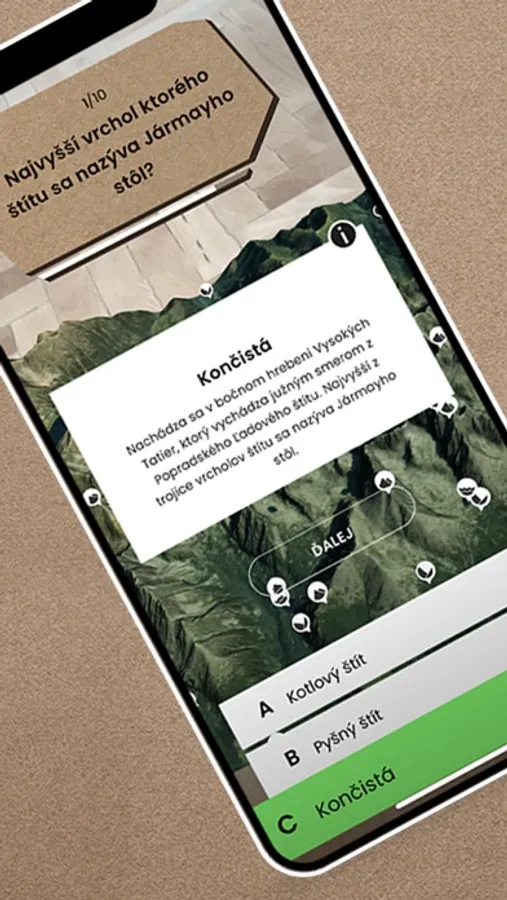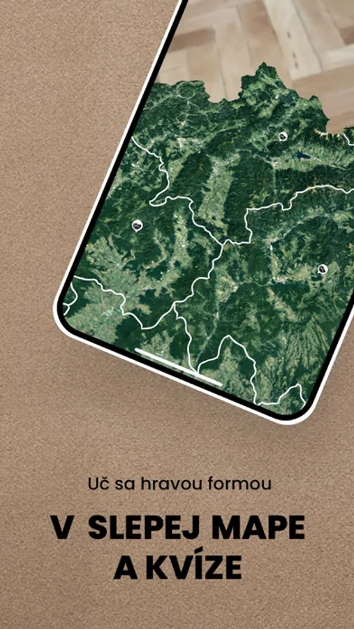 * V kvíze dostaneš vždy 10 náhodne vybraných vedomostných otázok z vyše 400, zostavených na základe informácií dostupných v aplikácii. V slepej mape budeš hľadať v každom z 10 kôl jeden náhodne vybraný bod aktuálneho geografického celku.