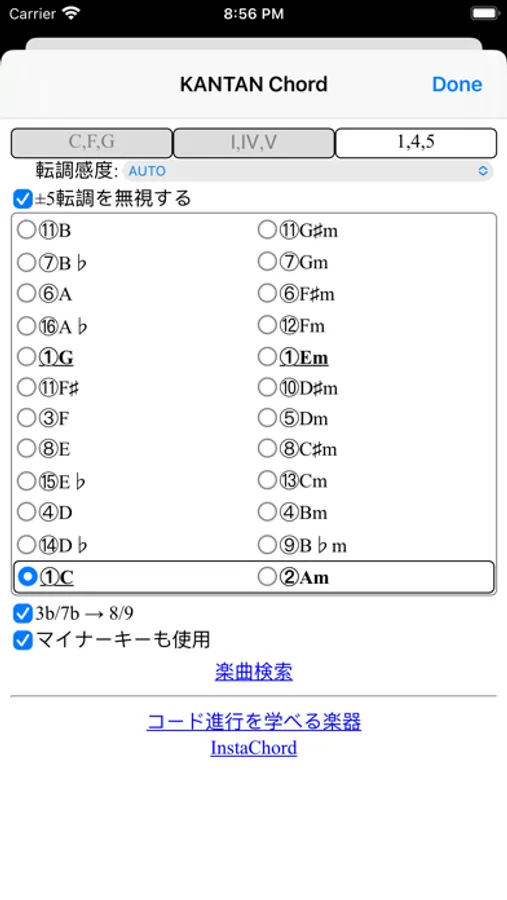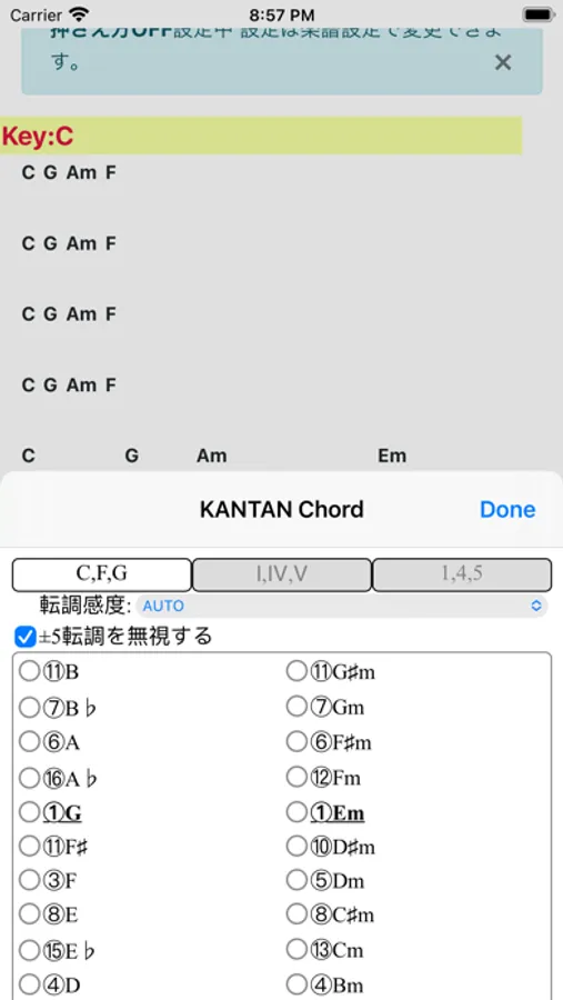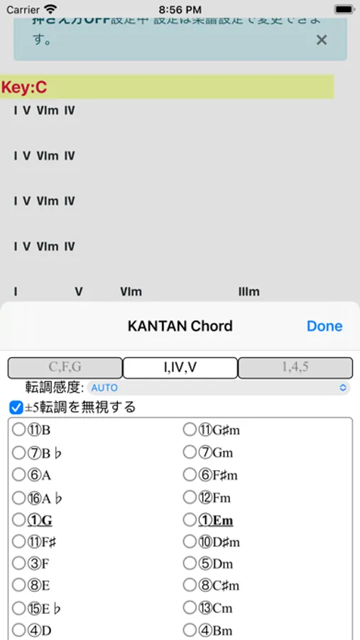 このオプションは「C,F,G」タブ選択時のみ有効で、「Ⅰ,Ⅳ,Ⅴ」タブや「1,4,5」タブを選択中の場合はオンでも表示されます。