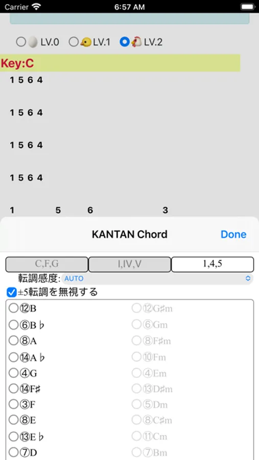 ディグリー表記(「Ⅰ,Ⅳ,Ⅴ」タブまたは「1,4,5」タブ)では基準となるキー(調)を変更できます。