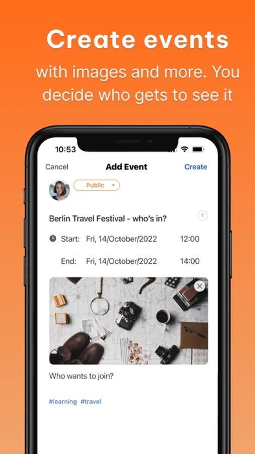 - Create your upcoming plans in a playful, social media-like way. You are in control who gets to see it!