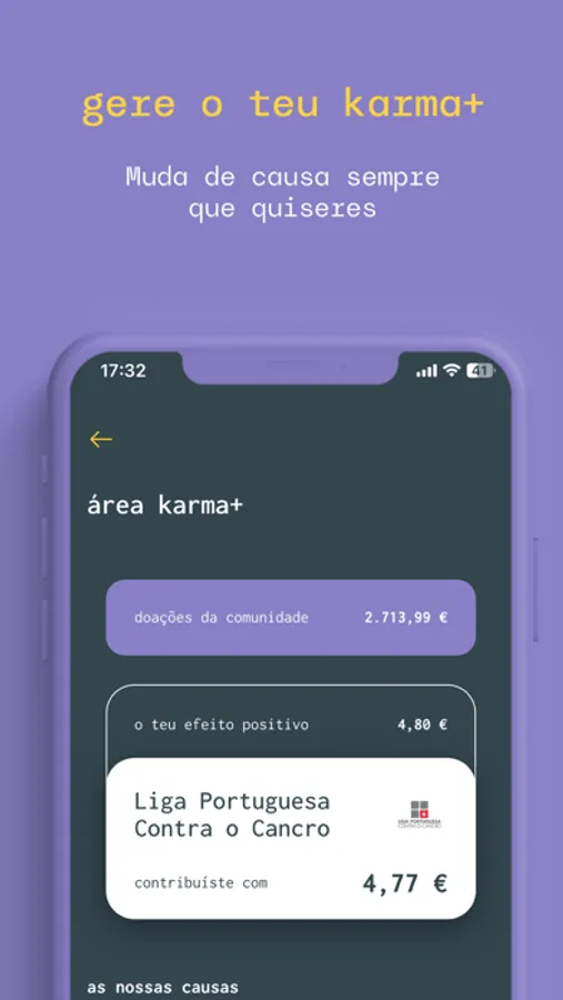 Foi por acreditar que investir na sociedade traz retorno para todos que o Banco Montepio criou o karma+. Um cartão de débito único em Portugal que transforma € em algo +. Isto porque sempre que usas o teu cartão karma+, parte das taxas são doadas a uma causa social à tua escolha. Através desta app vais poder: