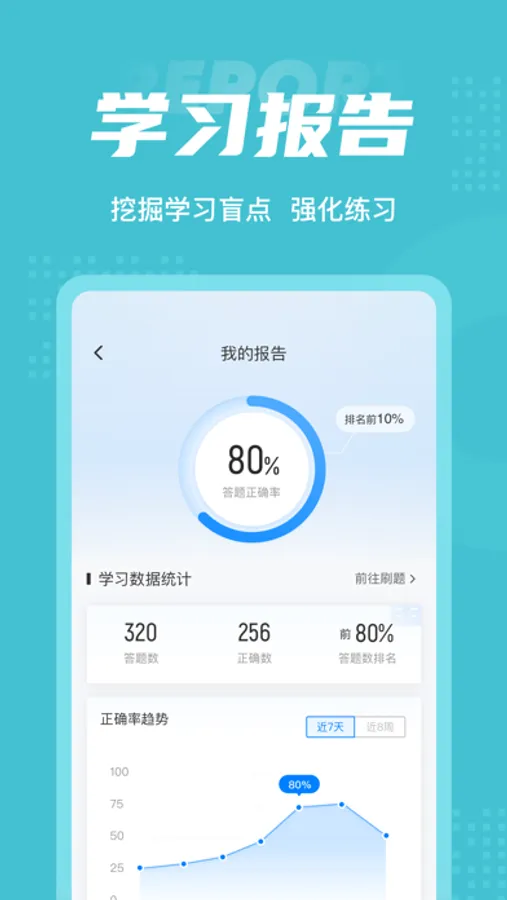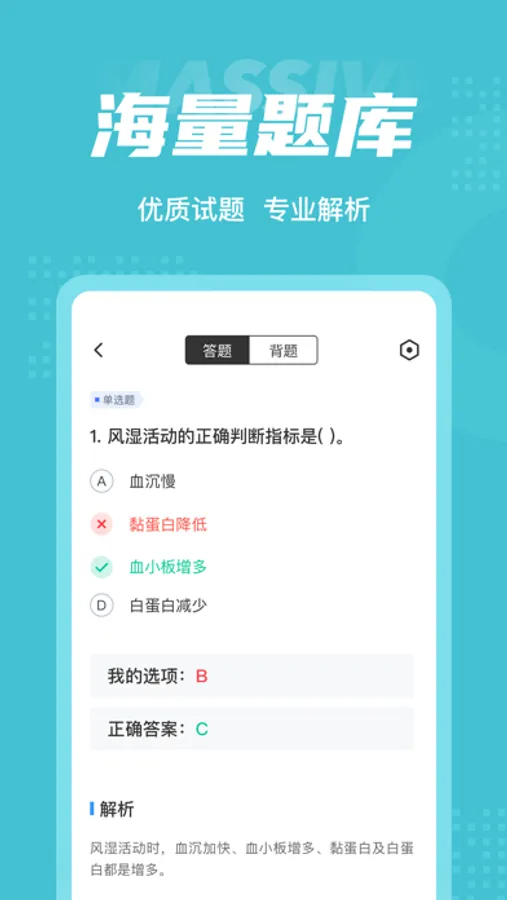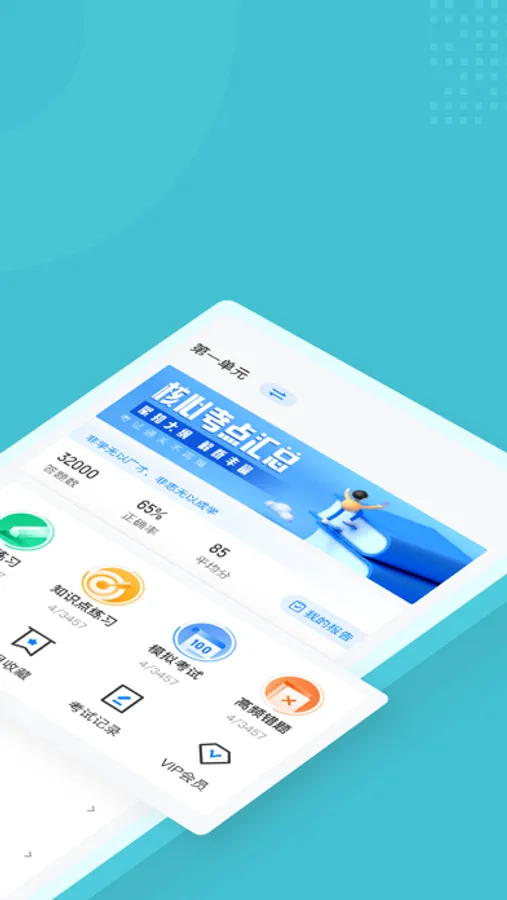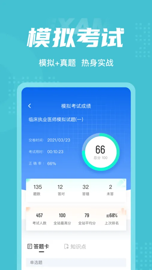 临床执业医师题库内含考点练习,全国通用卷以及地区卷模拟练习,以及按照固定考试比重的随机式的抽题的真题考场,成绩单实时记录考试数据,一点一滴的反馈考生近期学习状态以及自我正确率的提升,大大的给予考生通过考试的信心。