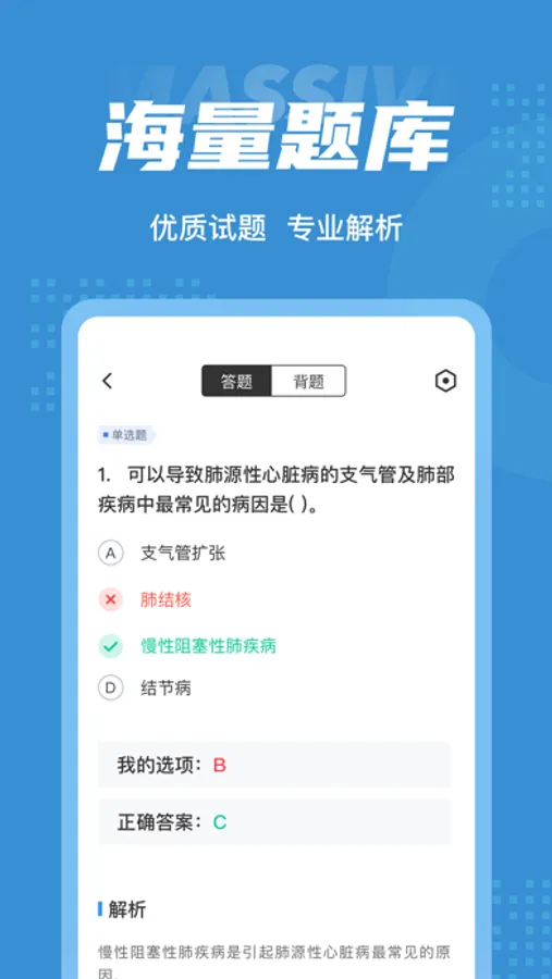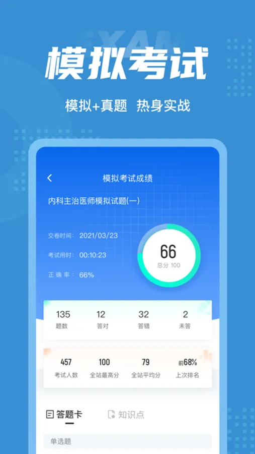 内科主治医师题库内含考点练习,全国通用卷以及地区卷模拟练习,以及按照固定考试比重的随机式的抽题的真题考场,成绩单实时记录考试数据,一点一滴的反馈考生近期学习状态以及自我正确率的提升,大大的给予考生通过考试的信心。