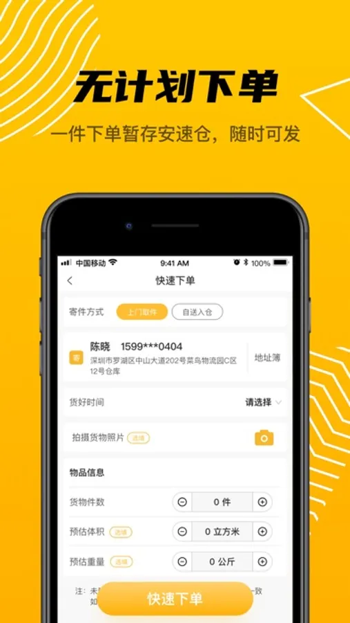 对于未明确目的仓的货件,支持用户在客户端无计划下单,用户在线填写货件信息并预约司机上门取件或自送入仓。支持用户将货物暂存安速仓库,待明确目的仓后可随时前往预报订单线上发货。