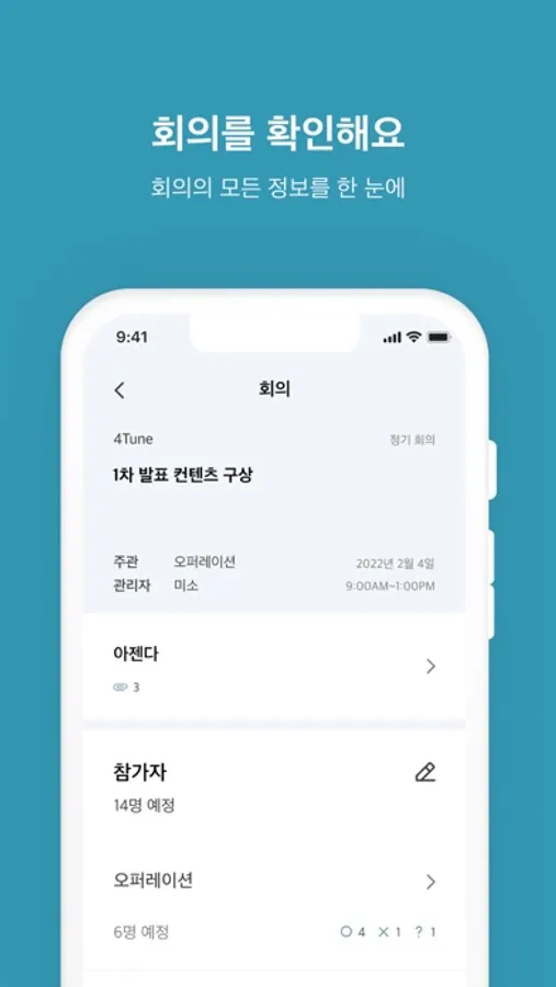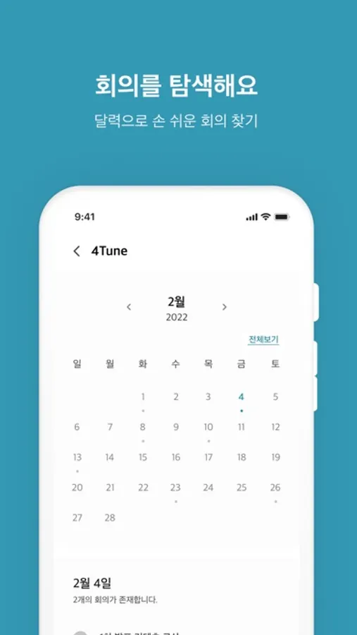 주어진 회의를 한눈에. 캘린더와 회의카드로 회의 일정을 확인하고 준비해보아요.