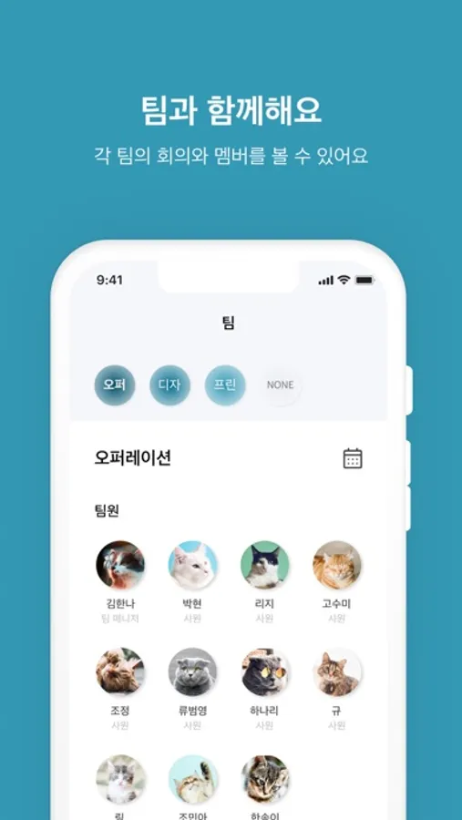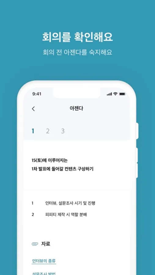 모두에게 명확한 회의. 회의 전에 정보를 숙지하고 본인의 상태를 공유할 수 있어요.