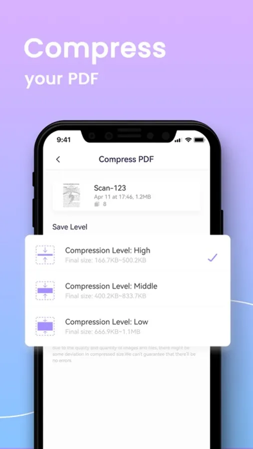 • Compress PDF: Reduce the file size of your document while keeping visual quality.