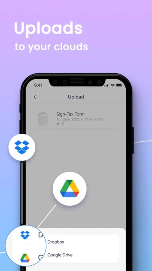 • Upload scanned documents to cloud services like Dropbox and Google Drive.
