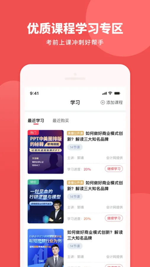 多样化课程体系,全新精品课、大师课、学习课件为辅满足不同学员的需求;音/视频随心切换,倍可调,碎片时间听一听,学一学,移动听课更方便,与名师互动零距离,;用你喜欢的方式,跟着喜欢的老师享受学习每一刻。