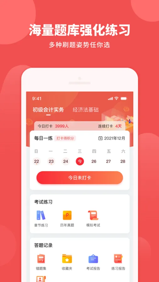 做题记录,错题集合,详细记录个人做题数据,有针对性的反复练习,量身打造专属会计题库;
