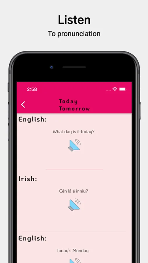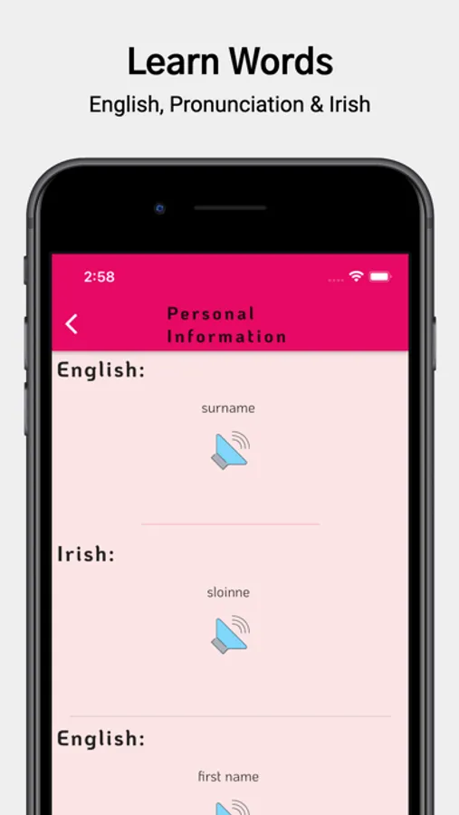 • In every lesson, you can listen to the Irish word pronunciation as well as see Irish word in english language.