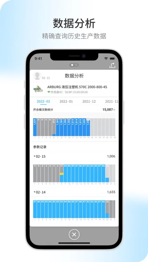 5.透过计数传感器,实时记录开合模次数,使员工方便、及时的获取成型机器运行数据。