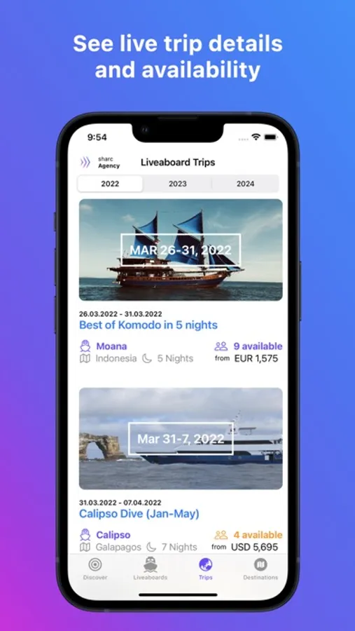 sharc Agency has 100% live availability and real-time reservation options. You receive instant confirmation and the updated cabin spaces are distributed automatically to the entire sharc travel agency network and third party widgets.