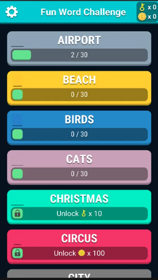 You can select up to 38 different categories. Each topic has 30 levels each, as well as an option of customised levels depending on which difficulty you select. Completing all 30 levels in a category will give you a key. Keys are needed to unlock some topics. You also obtain coins after the completion of a level. Coins are used to unlock other categories or can be used to help you complete levels.