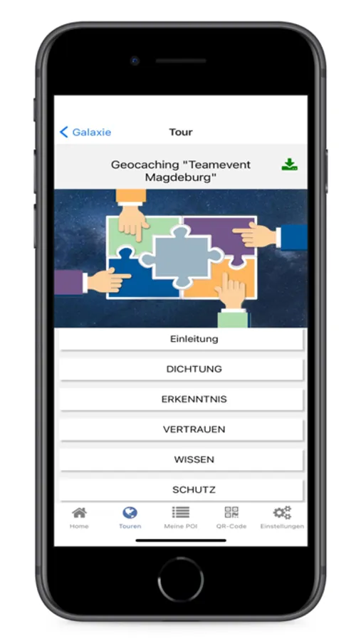 Die App Teamwork enthält 4 Module, die für unterschiedliche Altersgruppen und Freizeitaktivitäten konzipiert wurden. Zwei Touren wurden als Teamevent für Erwachsene, eine Agententour für Jugendliche und eine Schatzsuche für Kinder ab 12 Jahren entwickelt.